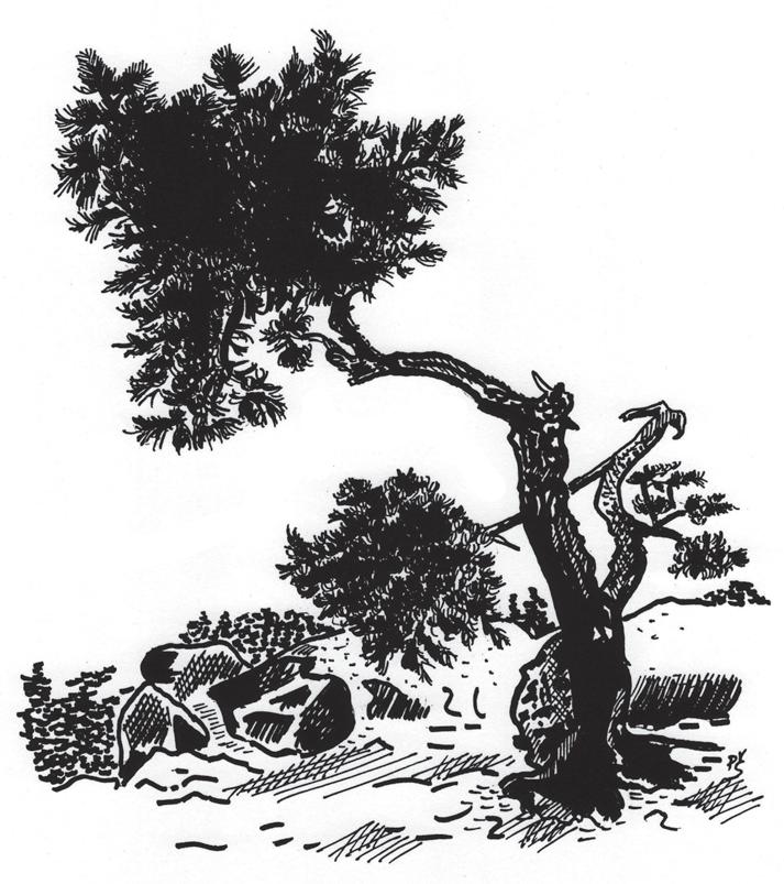 Bonsaj borovice s pokrouceným kmenem v literátském stylu zasazená v kulaté nádobě. Kresba této bonsaje je na str. 8