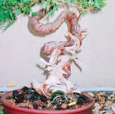 Kmen tohoto jalovce je sice pokroucený, ale přesto dobře utvářený. Navíc je použita technika mrtvého dřeva