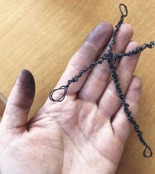 hlavní kouzlo „domečkových“ panenek spočívá v jejich ohebnosti a polohovatelnosti. Ty jsou zajištěné vloženou drátěnou kostrou uvnitř tělíčka a končetin. Na tyto výztuže se mi nejvíce osvědčil obyčejný vázací drát o průměru 0,65 – 0,7 mm, prodávaný navinutý na dřevěném hranolku. Doporučuji koupit lakovaný (většinou zelenou barvou), popřípadě pozinkovaný (stříbrný), pokud si ovšem nechcete při práci řádně začernit ruce.