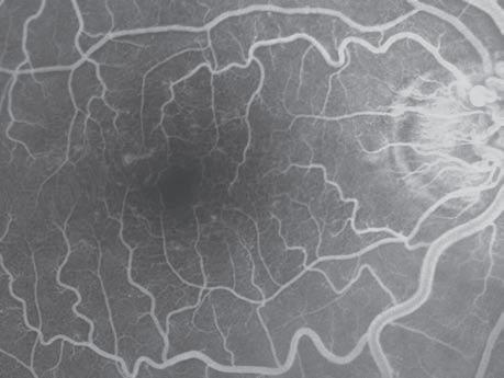 Obr. 1.4 Foveální avaskulární zóna, detail foveální oblasti na snímku fluorescenční angiografie