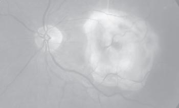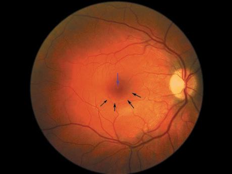 čípků (centrální nakupení čípků). Z důvodu vysoké koncentrace fotoreceptorů a jejich těsného nahuštění jsou jádra čípků uspořádána do více vrstev v kruzích, což připomíná tvar koláče (gateau nucleaire). Ztráta foveolárního reflexu může být první klinickou známkou poškození sítnice (Kanski, 2003).