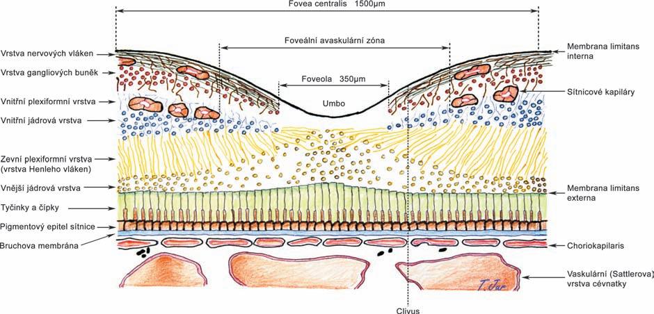 Fovea centralis představuje jamkovitou prohlubeň vnitřního povrchu sítnice uprostřed makuly o průměru 1500 μm (což odpovídá 5° centrálního zorného pole). Nachází se 3 mm temporálně od centra terče zrakového nervu. Průměrná tloušťka sítnice je zde 250 μm. Fovea se skládá ze zesíleného okraje, zešikmené stěny pod úhlem 22° – clivus – a spodiny, která odpovídá foveole. Čípky představují dominantní fotoreceptor fovey. Jejich uspořádání je výsledkem centripetální migrace prvního neuronu a centrifugálního laterálního posunu druhého a třetího neuronu v průběhu maturace fovey, k čemuž dochází tři měsíce před a tři měsíce po porodu. Výsledkem uvedených posunů je anatomicky patrné prohloubení fovey. K centrální migraci fotoreceptorů dochází v oblasti sítnice o průměru 1500 μm (fovea) – viz obr. 1.2. I když je zde vzhledem k výraznému nakupení průměr jednotlivých čípků zúžený, uchovávají si objem díky svému prodloužení až na 70 μm. Žlutá barva fovey a makuly je dána pigmenty ze skupiny karotenoidů – luteinem a zeaxantinem, které se nacházejí v axonech čípků, v bipolárních a gangliových buňkách. Tyto karotenoidy slouží mimo jiné jako filtr a ochrana proti krátkovlnnému UV záření. Oftalmo-