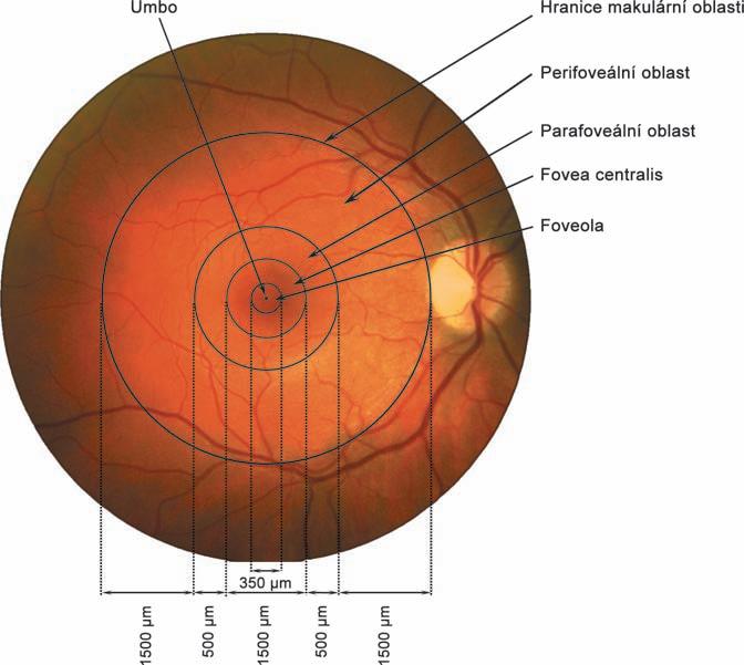 Makulou rozumíme z pohledu klinické anatomie okrouhlou centrální oblast (area centralis) na zadním pólu oka o průměru 5,5 mm, což odpovídá přibližně 15° centrálního zorného pole. Na rozdíl od extramakulární – periferní – sítnice obsahuje více než jednu vrstvu gangliových buněk (periferní sítnice obsahuje pouze jednu vrstvu gangliových buněk). Hranice makulární krajiny korelují s průběhem obou hlavních temporálních cévních arkád. Makulu utvářejí umbo, foveola, fovea, peri- a parafoveální oblast – viz obr. 1.1.