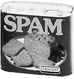 • lančmítu (…), která se vyrábí od 30. let dodnes (v současnosti ale výrobce trvá na psaní velkým písmem SPAM) a za 2. světové války a po ní byla hojně rozšířená a stále méně oblíbená ve Velké Británii. Proto se objevuje v závěrečném skeči 25. dílu seriálu Monty Pythonův létající cirkus, kde všechny položky jídelního lístku v restauraci obsahují spam, i mnohokrát opakovaně, a spory zákazníků s číšnicí o objednávky přerušuje skupina Vikingů zpívajících “Spam, spam, spam...” [4].