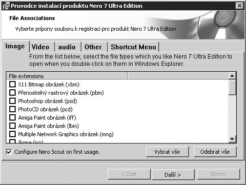 Důrazně doporučujeme žádné asociace k programu Nero nevytvářet, pokud je skutečně nebudete chtít tímto programem editovat (například soubory WAV programem Nero WaveEditor. Proto všechna ostatní zaškrtnutí na kartách Image, Audio, Video a Other zrušte.