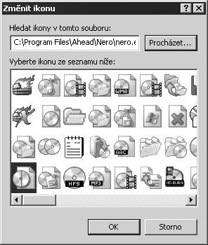 V tomto okně stiskněte tlačítko Změnit ikonu. V otevřeném dialogovém okně Změnit ikonu stiskněte tlačítko Procházet a v dalším dialogovém okně vyhledejte ikonu programu Nero; najdete ji touto cestou: C:\Program Files\Ahead\Nero\nero.exe. Jakmile dialogové okno Procházet zavřete, zobrazí se vám několik desítek ikon, které soubor Nero.exe obsahuje a z nichž můžete vybírat nejen při této příležitosti – viz obr. 1.17.