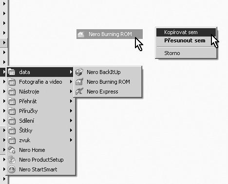 Nu a pokud vás to ještě nenapadlo, tak malý dodatek. Zástupce této složky si umístěte na panel Snadné spuštění (zavřenou ikonu přesuňte na tento panel pravým tlačítkem myši a z místní nabídky zadejte příkaz Vytvořit zde zástupce). Kdykoli pak budete chtít spustit některou část programového balíku Nero, otevřete z panelu Snadné spuštění okno Nero, odkud již lze spustit cokoli.