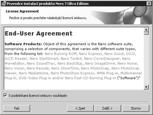 Text licenčního ujednání je důležitý. Je v něm totiž popsáno, za jakých podmínek smíte program používat. Tím, že vydáte souhlas s přijetím licenční smlouvy, vyslovujete souhlas se vším, co je zde napsáno. Pokud budete program užívat jiným způsobem, vystavujete se sankcím. Mohou být zvláště tvrdé, pokud byste program Nero užívali ke komerčním účelům.