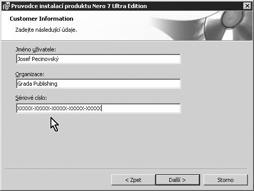 Nutnou podmínkou další instalace je přijetí všech ujednání licenční smlouvy, jinak vás průvodce nepustí dál. Jakmile přepnete přepínač do správné polohy a stisknete tlačítko Další >, následující panel průvodce si vyžádá vaše jméno a jméno vaší společnosti – viz obr. 1.6. Chcete-li program používat jako ostrou verzi, je třeba zadat ještě Sériové číslo, které při koupi programu získáte.