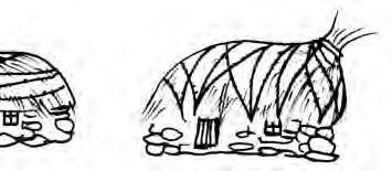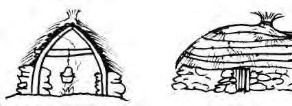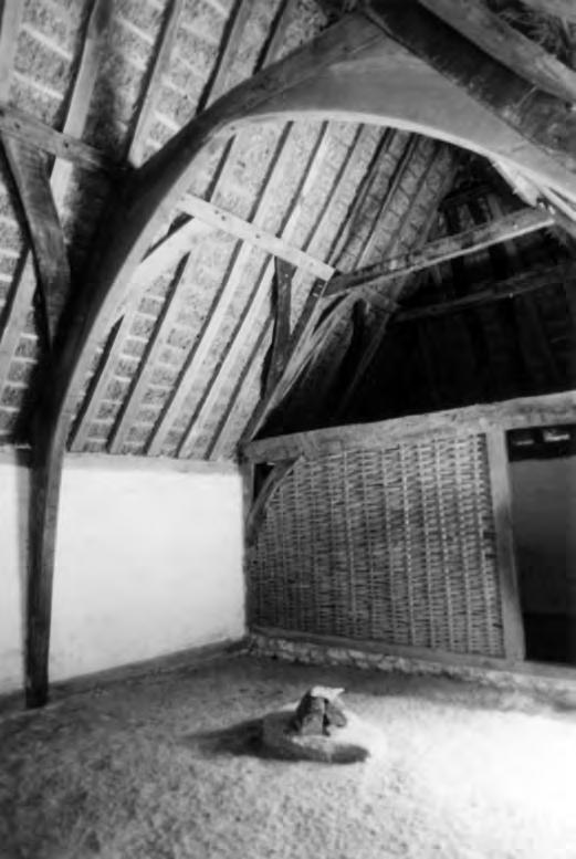 novce, kapradí, vřesu či rákosu, které rostly poblíž. Byla to již vyspělá konstrukce anglicky nazývaná cruck, francouzsky courbo. Dokázala překlenout 6,5 až 9,5 m a sestavit tak široký prostor. Dvojice sloupů ve výšce kolem 1,6 až 5 m přepažoval trám zvaný spona (tie beam), k němu byly připevněny proutěné příčky oddělující tři prostory. Na spony dvou středových párů zakřivených sloupů se kladl trámek sloužící k zavěšení kotle, konvice nebo kovaného kruhovitého roštu na grilování nad ohništěm. Pro únik dýmu byl dřevem a hlínou upraven