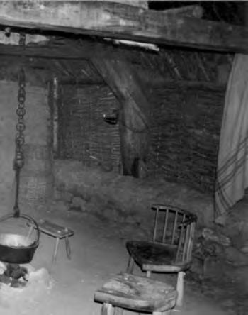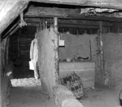vřesu nebo jiného rostlinného materiálu. Krytina byla pevně stažena provazovou sítí, aby mohla vzdorovat atlantickým vichrům. Uvnitř se člověk cítil jako v zahloubeném zemním obydlí, pohyboval se v šeru a v předklonu. Lehkými nízkými příčkami byla oddělena část pro ustájení dobytka na jednom konci, ve středu na zemi leželo ohniště se zavěšeným kotlem, kouř odcházel otvorem ve střeše nad ním a stěnovou příčku tvořila bedněná skříň pro spaní. Zaváděla se až v 18. stol., dříve spávali na vřesové či kapradinové vrstvě. Na druhém konci za rámovou proplétanou příčkou měli komoru s nářadím a potravinami.