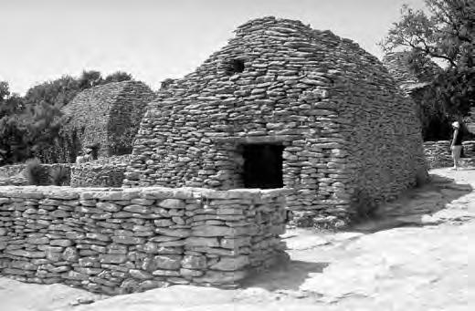 v pohoří Périgord provincie Dordogne (osada Breuil nad vsí Allas u Les Eyzies). Kromě kuželovitých staveb na nízké, zaobleně čtvercové podezdívce u Gordes stojí také obdélné kamenné stavby sarkofágového tvaru s vysokými valenými klenbami. Kruhový půdorys a snadno zhotovitená konstrukce se považuje za pozůstatek předhistorických období a předantických kultur, místy se dochovaly na velkém území od Sýrie po Island. Tehdy lidé v průběhu svého života snadněji měnili polohu svých sídel. Kruhový princip patří kulturám jiného typu, než známe z evropských dějin, a dědil se jen tam, kde stále přežívaly jeho funkce extenzivního pastevectví, jako zrnko vytrhnuté ze stavební tradice dávno nahrazené náročnějšími formami (např. pohoří Balkán, středojižní Francie, Baskicko a Galicia v severním Španělsku aj.). Kruhové tvary opevněných vojenských táborů (např. Irsko, Dánsko, Švédsko) a rybářských obydlí (např. Irsko, nebo skotské ostrovy Shetlandy a Orkneye) zanikaly již ve středověku, protože nevyhovovaly novým nárokům šířícím se ze středomořské oblasti. V době posledního vrcholu římské civilizace ve 4. stol. se zaalpská Evropa teprve probouzela z pravěkého způsobu života. Hospodář-