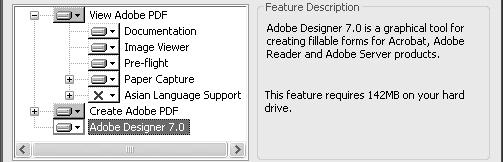 6. Během uživatelské instalace můžete ve stejném dialogovém okně též zvolit složku, do které se program nainstaluje. Standardně si instalační program zvolí složku \Program Files\ Adobe\Acrobat 7.0\Designer 7.0. Po dokončení instalace je program Acrobat připraven k používání.