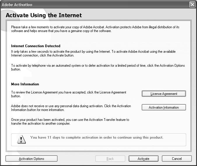 Aktivace programu Acrobat je nezbytná v období 30 dnů po instalaci. Produkt se aktivuje po telefonu nebo přes Internet.