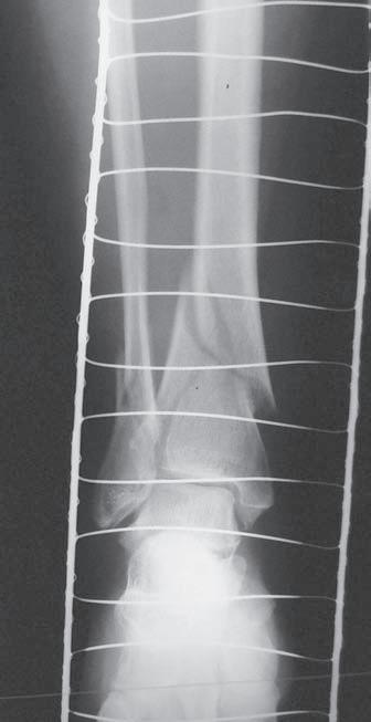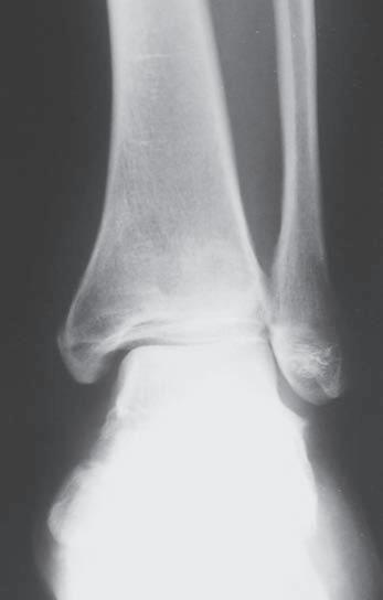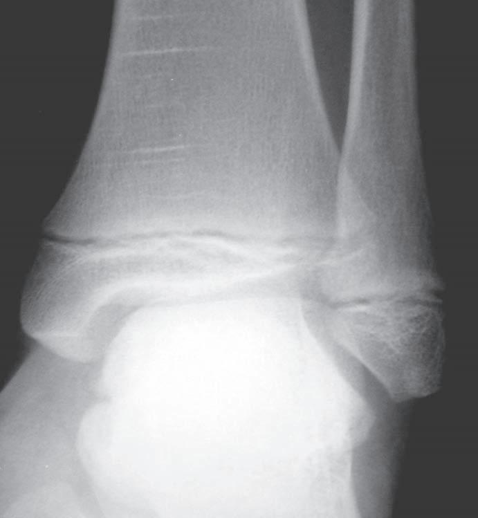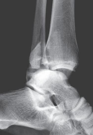 O br. 1. 2 S k iagram hl ezna v pře d oza d ní proje k ci (a) – d is k rétní z d vojení k ontury mediálního kotníku (viz šipka), jinak zdánlivě normální nález; skiagram hlezna v boční projekci (b) – fraktura zadní hrany tibie a zadní části vnitřního kotníku, subluxační postavení v talokrurálním kloubu (viz šipka) ab