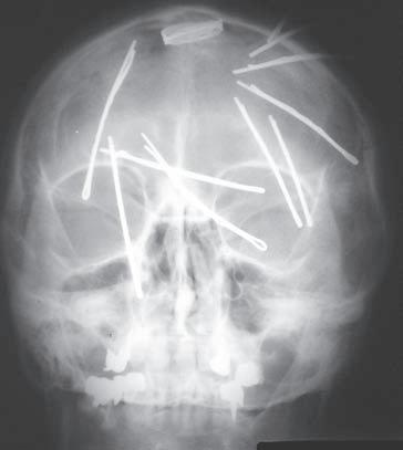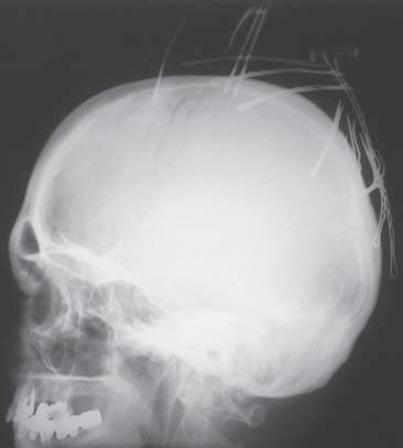 O br. 1. 1 Princip d vou proje k cí. S k iagram l e bk y v pře d oza d ní proje k ci (a). Spon k y do vlasů ne j sou lokalizovány intrakraniálně, ale na temeni ve vlasech, j ak j e zře j mé ze skiagramu lebky v boční projekci (b)