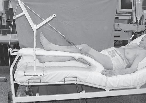 Obr. 2.8 Kirschnerova extenze – skládá se z Braunovy dlahy, podkovy a závaží. Tah musí vždy působit v ose končetiny