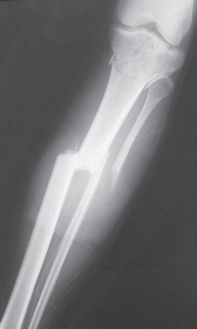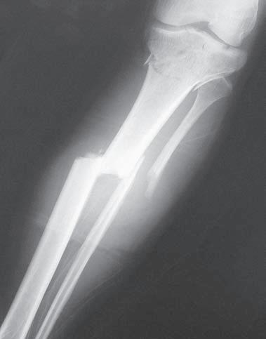 Obr. 2.3 Tříštivá zlomenina diafýzy tibie – hlavní fragmenty, tj. proximální a distální, nejsou v kontaktu. Typ C podle AO klasifikace