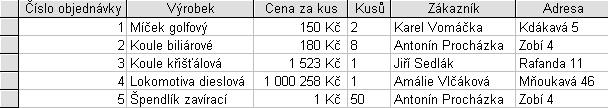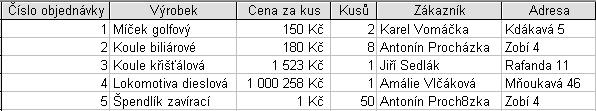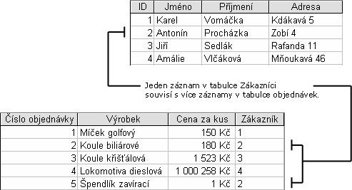 Jak je vidět, jméno a adresa každého zákazníka se v tabulce vyskytuje pouze jednou, bez ohledu na množství objednávek. Tabulka objednávek totiž neobsahuje jméno a adresu, jak tomu bylo v předchozím příkladu, ale pouze čísla záznamů (z tabulky Zákazníci), které obsahují správné informace.
