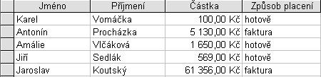 Podíváte-li se na předchozí záznamy, zjistíte, že nejpřehledněji by byly zobrazeny ve formě tabulky, jejíž řádky by odpovídaly jednotlivým zákazníkům a ve sloupcích by byly obsaženy jednotlivé údaje vztahující se k danému zákazníkovi, jak to můžete vidět na obrázku 1.1.
