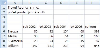 Představte si situaci, kdy potřebujete v následující tabulce posunout buňky ve sloupci E doprava, protože jste udělali chybu a zapomněli jste uvést údaje roku 2005. Kromě toho se nadpis v osmém řádku se nevejde do buňky a také jste neuvedli řádek s údaji pro zájezdy do Austrálie.