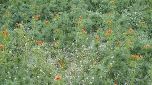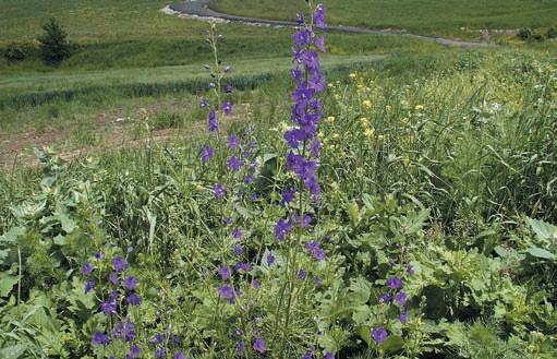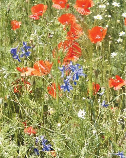 Ostrožka stračka a vlčí mák a další plevele při okraji pole