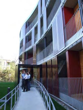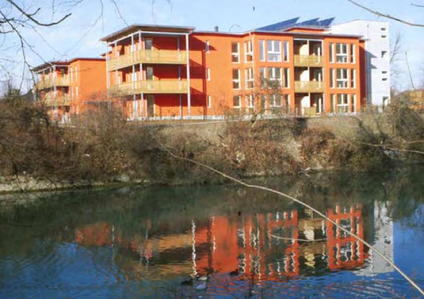 Obr. 1.2 Nízkoenergetický bytový dům Wohnpark Sandgrubenweg v Bregenzi (Rakousko). Jeden z projektů rakouského programu Haus der Zukunft, Atelier für Baukunst, Wolfgang Ritsch, Gerhard Hörbuger, Helmuth Kuess, Norbert Schweitzer [5]