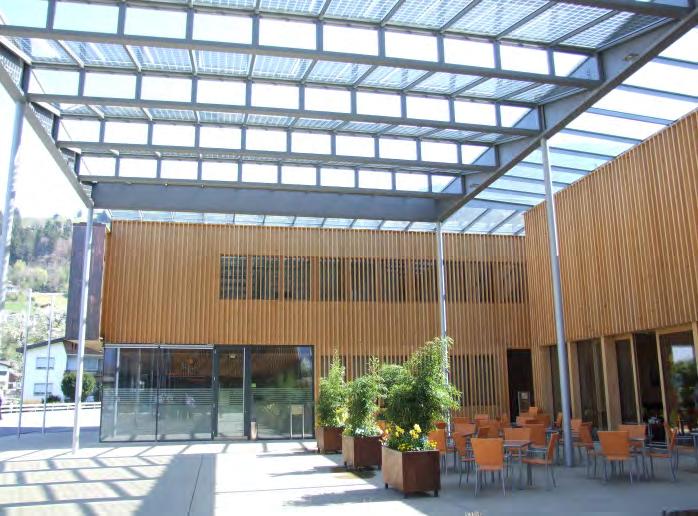 Obr. 1.3 Obecní centrum v Ludeschi, Vorarlbersko (Rakousko). Ukázkové řešení pasivní budovy s důrazem na širší souvislosti udržitelné výstavby a kvality vnitřního prostředí (H. Kaufmann) [5]