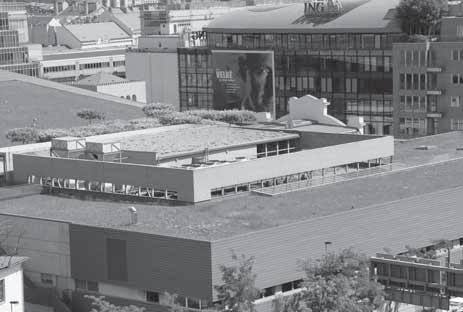 Na střeše je zrealizována část zeleně jako extenzivní, část jako intenzivní, určitá plocha je zatravněna. Bylo použito 19 odlišných typů skladeb. Na střeše byly vysazeny speciálně (do tzv. střechy) tvarované platany.