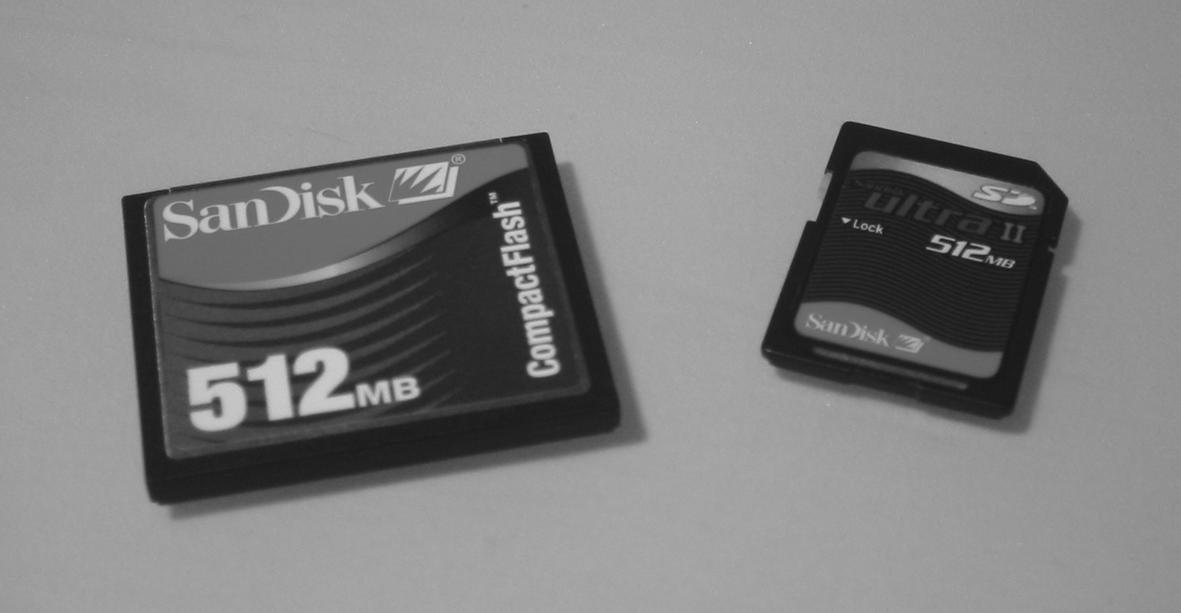 Obr. 1.5: Paměťové karty typu CompactFlash (vlevo) a Secure Digital (vpravo)