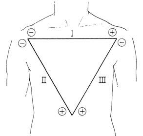 Elektrody pro bipolární svody se standardně umísťují na pravou a levou horní končetinu a levou dolní končetinu. Označujeme je jako svody I, II, III a jejich polaritu určujeme konvencí dle Einthovenova trojúhelníku (obr. 2.3). Jestliže spojíme tyto t ř i elektrody přes odpor 5000 ohmů, získáme nulový potenciál, proti němuž mů žeme