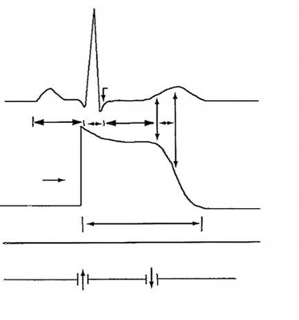 Obr. 2.2 Elektrokardiogram a ak ční potenciál myokardiální buňky Upraveno dle Gabriel KM. On call cardiology, Philadelphia, Saunders 2001.