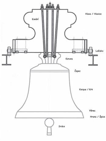 Vrchol zvonu pod korunou je nazýván čepec, pod ním je krk nebo také plášť a nejširší místo ve spodní části je věnec. Pak už následuje hrana neboli špice.