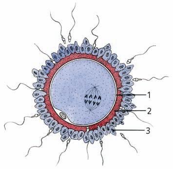 Sekundární oocyt ve stadiu II. zracího dělení. Spermie radiálně nahromaděné okolo oocytu se snaží proniknout mezi buňkami corona radiata kvajíčku. Jedna ze spermií pronikla skrze zona pellucida aje již vpřímém kontaktu smembránou oocytu. 1–buněčná membrána oocytu, 2 – zona pellucida, 3 – folikulární buňky corona radiata.