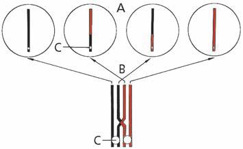 A, B – schéma rekonstruovaných chromozomů po jejich uvolnění zchiasmat, C–centromera.