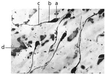 Obr. 2.9 Mikrofotografie nátěru spermatu dospělého muže (Heidenhain, 1200×). a– hlavička spermie, b – krček spermie, c–bičík, d – odloupnutá epitelová buňka zvýstelky vývodových cest.
