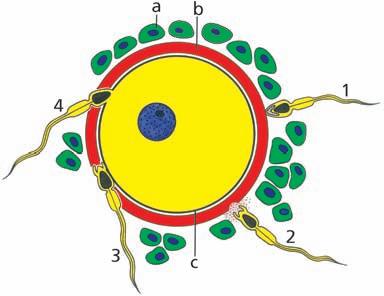 Obr. 2.19 Schéma interakce spermie avajíčka vprůběhu fertilizace. 1 – spermie se shlukují na povrchu oocytu, přivráceny hlavičkami sakrozomálním váčkem kpovrchu zona pellucida, 2 – enzymy se uvolnily zakrozomálního váčku apronikají do zona pellucida, 3 – hlavička jedné ze spermií dosáhla oolemmy, 4 – plazmalema spermie splynula soolemmou. a– folikulární buňky, b – zona pellucida, c – oolemma.