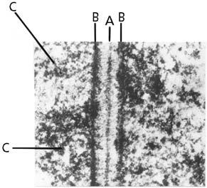 A– centrální pásek, B – laterální pásek, C – chromatinové vlákénko.