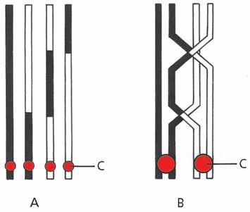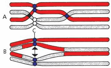 Obr. 2.4 A – Schéma rekonstruovaných chromozomů po jejich uvolnění zchiasmat, B – Schéma dvojitého „crossing-over“ homologických chromozomů (jeden chromozom naznačen černě, druhý je bílý), C – centromera