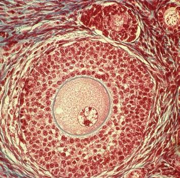 Obr. 2.14 Mikrofotografie řezu ovariem mladé ženy (modrý trichrom, 300×). Snímek zachycuje rostoucí preantrální folikul složený zvajíčka obaleného vrstvou radiálně uspořádaných folikulárních buněk. Ve vajíčku je veliké měchýřkovité jádro se sytě červeně zbarveným jadérkem. Na povrchu vajíčka, zevně od tenké, červeně zbarvené buněčné membrány, je modře zbarvená zona pellucida. Vokolí folikulu je řídké vazivo bohaté na fibroblasty.