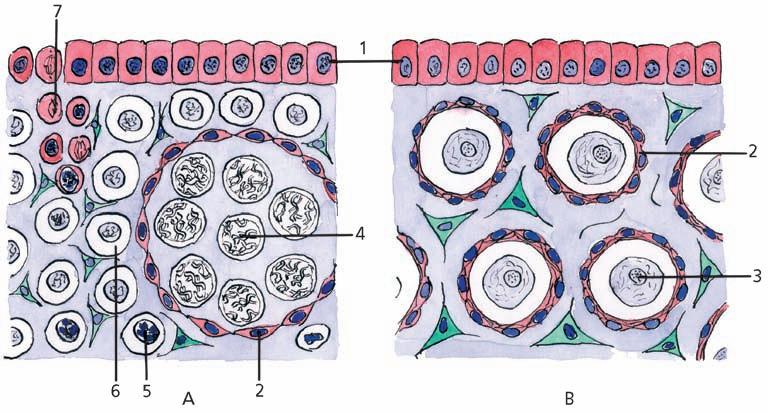 Obr. 2.11 Schéma řezu fetálním ovariem. A– ovarium fétu 2 měsíce starého, B – ovarium sedmiměsíčního fétu. 1 – célomový epitel na povrchu ovaria, 2 – folikulární buňky na povrchu primordiálních folikulů, 3 – jádro primárního oocytu, 4 – jádro oogonie vprofázi I.zracího dělení, 5 – jádro zanikající oogonie, 6 – oogonie, 7– výběžek célomových buněk prorůstajících mezi oogonie.