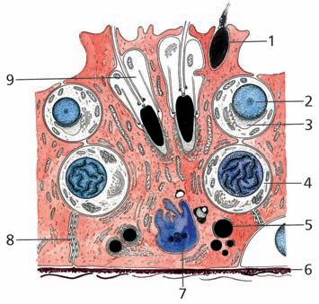 1 – jádro spermie, 2 – spermatida, 3 – akrozomální váček, 4 – spermiocyt skličkami chromozomů vjádře, 5 – inkluze lipidů vcytoplazmě Sertoliho buňky, 6 – bazální membrána kanálku, 7 – jádro Sertoliho buňky, 8 – specifický typ těsného mezibuněčného kontaktu Sertoliho buněk, 9–spermatida přeměňující se ve spermii.