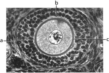 Obr. 2.13 Mikrofotografie řezu ovariem mladé ženy. Preantrální folikul (modrý trichrom, 800×). a– theca folliculi, b – folikulární buňky granulózy, c – zona pellucida.