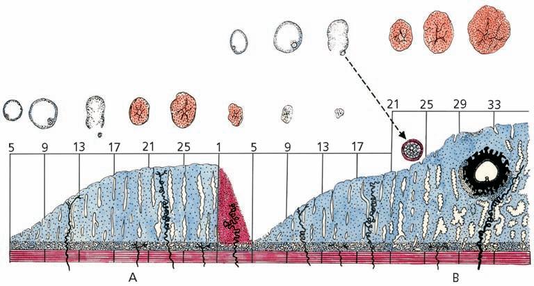 A– vprůběhu menstruačního cyklu, B – po oplození anidaci plodového vejce.
