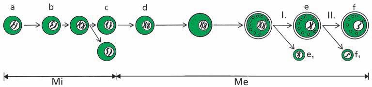 Obr. 2.16 Schéma oogeneze. a– gonocyt, b, c – oogonie, d – primární oocyt, e – sekundární oocyt, e1 – pólocyt I., f – zralý (terciární) oocyt,f1 – pólocyt II. I. – první zrací dělení, II. – druhé zrací dělení, Mi – mitóza, Me – meióza.
