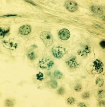 Vývoj mužských pohlavních buněk – spermií začíná vpubertě apokračuje celý život, ikdyž vpozdním věku může být kvalita spermií zhoršena. Spermie se vyvíjejí vsemenoplodných kanálcích varlete zkmenových buněk spermiogonií. Vpubertě se začínají kmenové spermiogonie ležící na samé periferii kanálků mitoticky množit. Mitózami kmenových spermiogonií vznikají jednak další kmenové buňky sdlouhým buněčným cyklem, které doplňují populaci kmenových spermiogonií, jednak spermiogonie, které zůstávají po průběhu mitózy spojeny mezibuněčnými můstky zvané spermiogonie typu A.Spermiogonie typu Amají krátký buněčný cyklus, rychle se opakovaně mitoticky dělí vněkolik populací (klonů), které se liší od kmenových buněk strukturou jádra. Buňky poslední populace (klonu) spermiogonií Ase zbazálních partií kanálků („bazálního kompartmentu“) posunují směrem kluminu avstupují jako spermiogonie typu B do prostorů vytvořených spojením výběžků Sertoliho buněk („adluminálního kompartmentu“). Spermiogonie B vkontaktu se Sertoliho buňkami se přestávají mitoticky dělit avstupují do profáze meiózy, během níž se zvětšují ve velké buňky spermiocyty (obr.2.6).