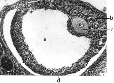 a– antrum folliculi, b – theca folliculi interna, c– cumulus oophorus svajíčkem, d – folikulární buňky granulózy.