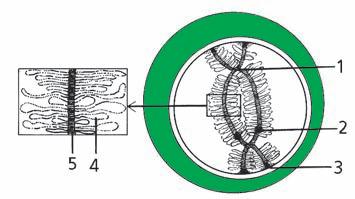 1 – „crossing-over“, 2 – centrozom, 3 – upínací ploténka chromozomu, 4 – chromatinové vlákénko, 5 – osové vlákno chromozomu.