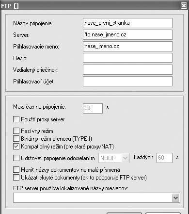 Server: (popř. Název hostingu:) – napíšeme ftp.nase_jmeno.cz. To je server FTP, na kterém budeme mít soubory stránky umístěny.