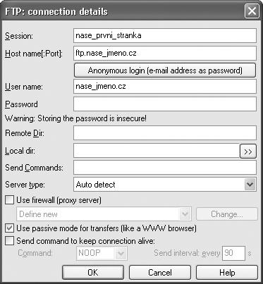Název připojení: (popř. Session:) – napíšeme nase_prvni_stranka. Je to jen název, který potom uvidíme při správě účtu FTP.